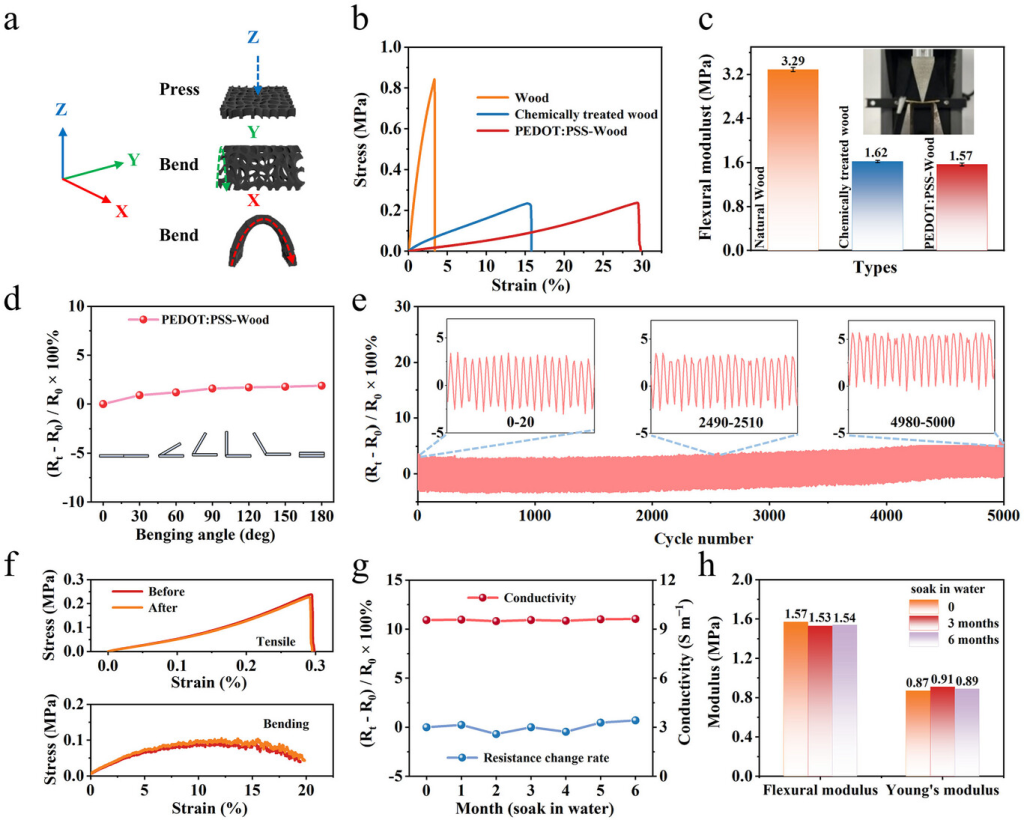 图3. PEDOT:PSS-Wood框架的机械性能和结构稳定性。a)PEDOT:PSS-Wood框架沿X和Y轴弯曲的示意图,以及其沿Z轴承受压力的能力。b)天然木材、化学处理木材和PEDOT:PSS-Wood框架在拉伸试验下的应力-应变曲线。c)三点弯曲试验下天然木材、化学处理木材和PEDOT:PSS-Wood框架的弯曲模量变化。d)不同弯曲角度下和e)5000次弯曲循环(角度:180°)期间PEDOT:PSS-Wood框架的电阻变化率,插图:第0-20次、第2490-2510次和第4980-5000次循环对应的循环弯曲的电阻变化率。f)PEDOT:PSS-Wood框架在拉伸和弯曲试验中被锤击(重量:5kg)前后的应力-应变曲线。g)PEDOT:PSS-Wood框架的电导率和电阻变化,h)以及在水中长期浸泡六个月后杨氏模量和弯曲模量的变化。