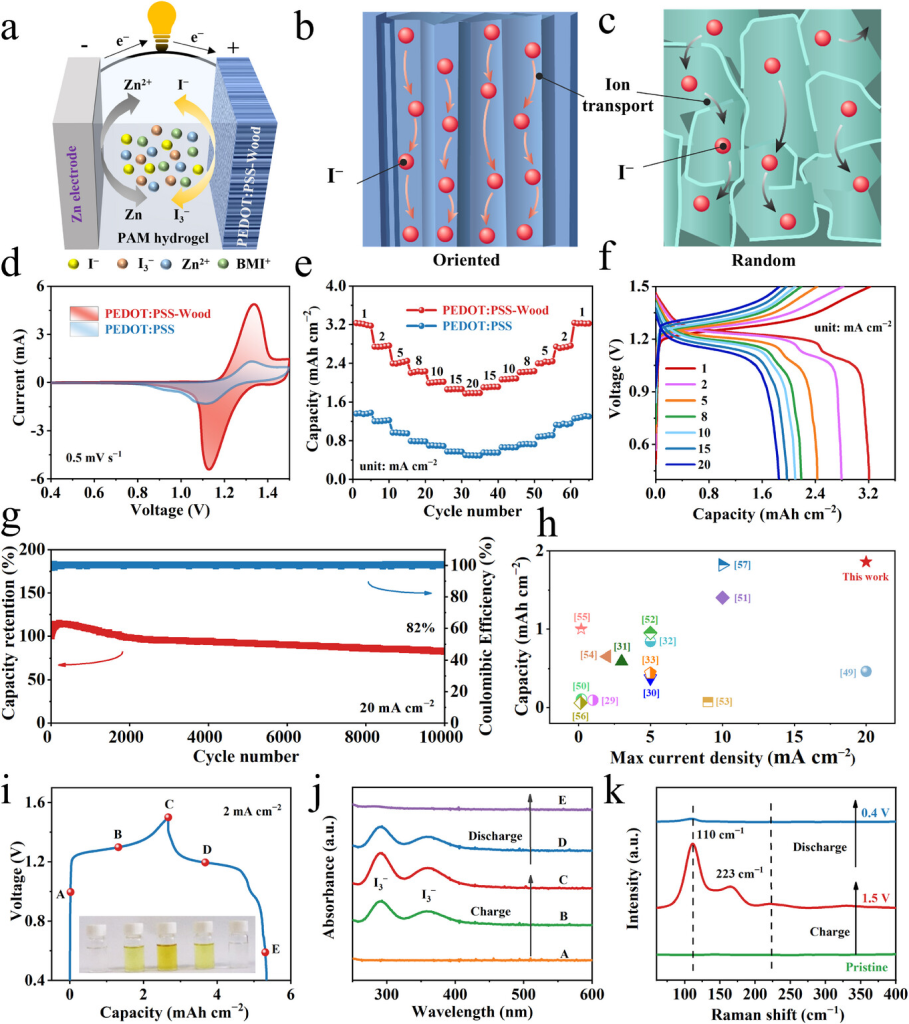 图4.柔性ZPPWIB的电化学性能及工作机理。a)柔性ZPPWIB工作原理示意图。b)取向和c)随机结构中离子扩散示意图。d)PEDOT:PSS-Wood和PEDOT:PSS基锌碘电池的CV曲线和e)倍率性能。f)电流密度为1至20mAcm−2时ZPPWIB的GCD曲线。g)20mAcm−2时ZPPWIB的长期循环稳定性。h)与其他报道的柔性锌离子电池在最大电流密度下的面积容量比较。i)2mAcm−2时ZPPWIB的GCD曲线,插图:不同电压下酒精浸出液的照片。j)不同电压下酒精浸出液的紫外-可见光谱。k)PEDOT:PSS-Wood正极在其原始状态、1.5V完全充电状态和0.4V完全放电状态的拉曼光谱。