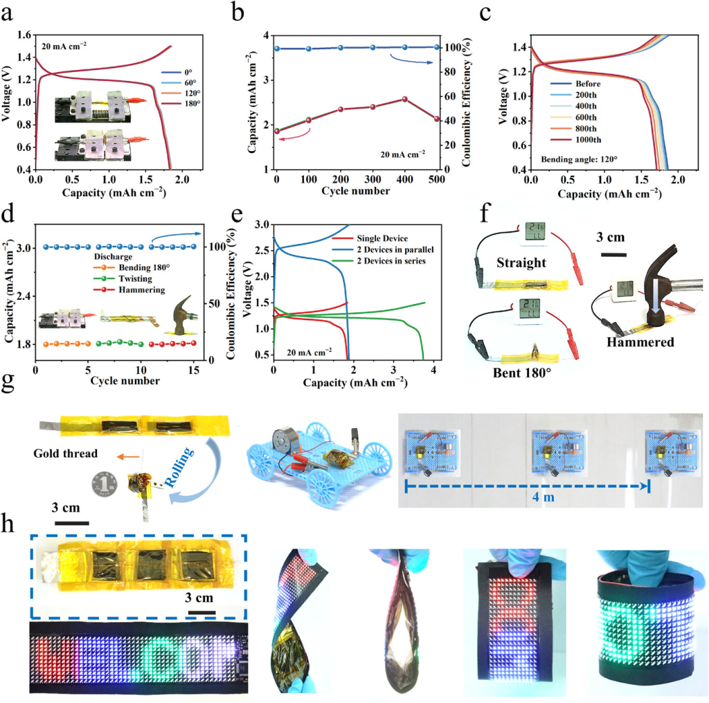 图5. 柔性ZPPWIB的柔韧性、可靠性及应用场景。a)柔性ZPPWIB在0~180°弯曲下的GCD曲线;b)保持180°弯曲下的循环性能。c)柔性ZPPWIB在0~1000次弯曲下的GCD曲线。d)柔性ZPPWIB在弯曲、扭曲和锤击条件下的容量和库仑效率图。e)单个电池、两个串联电池和两个并联电池的GCD曲线。f)单个ZPPWIB在平放、180°弯曲和锤击(重量:5kg)冲击条件下为湿度计供电的图像。g)两个串联ZPPWIB卷绕为玩具车供电。h)三个串联ZPPWIB在弯曲、扭曲和卷起条件下为柔性屏幕供电的图像。