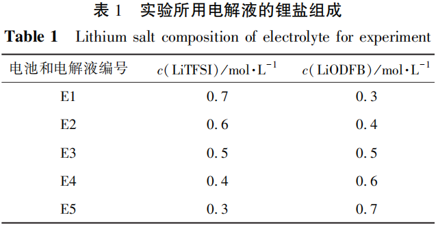 实验在手套箱中进行。将EC、EMC按体积比3∶7加入聚四氟乙烯瓶中配成混合溶剂,再将锂盐LiTFSI和LiODFB按不同物质的量比(见表1)溶解于上述溶液中。配制后封口,静置24h后待用。