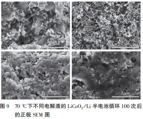 LiCoO2/Li半电池在不同电解液中循环后,电极表面的SEM测试结果见图9。E1组半电池在循环的过程中,铝箔被腐蚀,导致电极材料从铝箔上脱落,电池在循环到100次之前就已经失效,而其余4种电解液体系下的半电池均能循环100次。