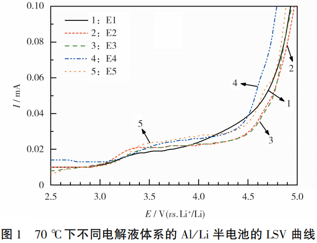 Al/Li半电池在不同电解液中的LSV测试结果见图1。从图1可知,Al/Li半电池在5组电解液中进行LSV测试,电流强度在3.1V处开始增加,对应着LiODFB的氧化分解。