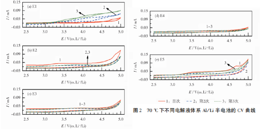 随着LiODFB加入量的增加,各电解液体系的氧化电流强度也随之增强。Al/Li半电池在不同电解液中的CV测试结果见图2。从图2可知,所有电解液的首次循环,在3.1V处均有电流增强的现象,随着循环次数的增加,E1电解液的腐蚀电流进一步增大,而其余电解液的腐蚀电流都趋于稳定。据此认为,E1电解液在70℃下不能完全抑制铝箔腐蚀。 CV测试结果表明,在70℃下,LiODFB的加入,可缓解LiTFSI基电解液对铝箔的腐蚀,但含量要超过0.3mol/L。