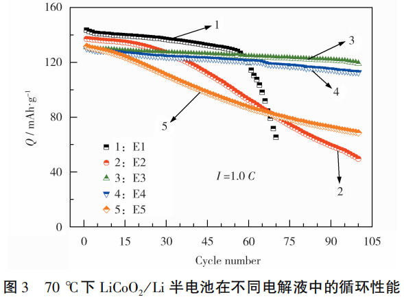 LiCoO2/Li半电池在不同电解液中的循环性能见图3。从图3可知,E1组半电池在70℃下循环60次以后,放电比容量骤然下降,原因在于E1电解液不能完全抑制铝箔腐蚀,导致正极材料从集流体上脱落。