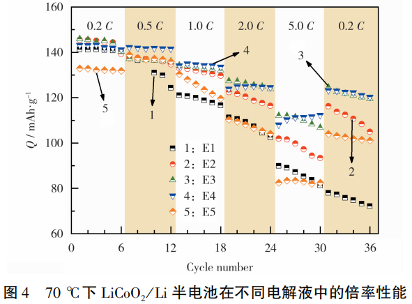 LiCoO2/Li半电池在不同电解液中倍率性能测试结果见图4。从图4 可知,在不同倍率下,E3和E4组半电池的放电比容量要高于其余3种电解液体系的。在经过高倍率的充放电后,E3和E4组半电池的容量衰减也相对较缓。这说明,E3和E4电解液体系在充放电过程中,电极表面形成的CEI膜足够稳定,能抑制高倍率充放电过程的极化现象,减轻不可逆容量损失。