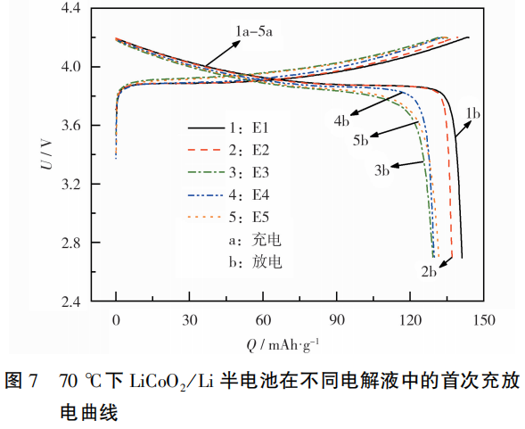 LiCoO2/Li半电池在不同电解液中的首次充放电曲线见图7。由图7数据计算可知,各个电解液体系下的半电池,首次循环的库仑效率均较低,E1~ E5组半电池首次循环的库仑效率分别为98.1%、98.3%、96.9%、97.3%和96.2%,原因在于半电池在首次循环过程中,会消耗一部分的Li+在电极表面形成CEI膜。E1和E2组半电池的放电比容量较高,是因为LiTFSI的含量较高,使得电解液离子电导率增大。