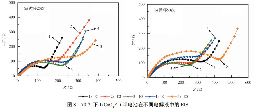 从图8(b)可知,经过50次循环后,5种电解液体系呈现出不同的阻抗变化。E1组半电池内部阻抗急剧增大,是由于LiTFSI对铝箔的腐蚀没有得到抑制。E2组半电池在循环50次后,电池阻抗明显增大,是因为在70℃下,CEI膜中的有机组分会溶解在电解液中,导致CEI膜遭到破环,导致电解液重新与电极界面接触发生副反应。E5组半电池体系在长期循环后,内部阻抗增大,可能是LiODFB的含量过多,降低电解液电导率,导致Li+的反应动力学速率减慢。此外,LiODFB过量时,会在电极界面生成可溶性产物BOF2-,这一类从而使得电池阻抗增大。E3和E4电解液体系循环25次和50次后阻抗变化不大,可认为电极表面形成了均匀的、机械稳定的CEI膜。
