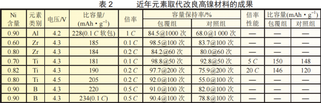 层状高镍材料在充放电过程中,会出现多次相变,从而导致多种失稳态出现,引起Li+/Ni2+混排、晶格氧不可逆释放以及副反应等问题,导致容量衰减。为解决上述问题,研究人员用特定元素取代高镍材料中的元素,即同异价元素取代。同异价元素取代能有效地抑制离子混排和晶格氧损失,并且会提高材料的锂离子传输能力,稳定材料结构,解决容量衰减问题,提高电池的工作性能。表2列举了数种新颖的元素取代修饰高镍材料的成果,下文按照元素种类介绍。