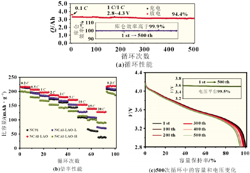电池倍率与循环性能有明显改善,材料表面与横截面结构完整,无明显破碎和开裂现象,差示扫描量热法(DSC)显示热失控得到有效控制,证明此复合包覆层对材料有突出的保护作用。此优化方案有效且制备流程简捷,可进行放大升级测试。