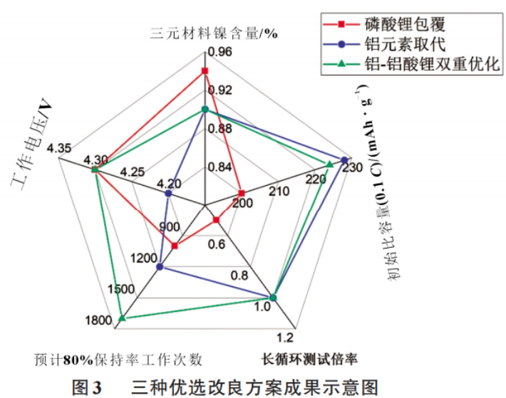 比较三类改良方案的优选组(如图3所示),三个方案的改性材料的镍含量类似,有横向比较价值。双重优化改良效果优于单一构筑纳米包覆层和同异价元素取代,并且软包电池数据验证该方案可进行放大生产,所以笔者认为未来高镍三元材料的改良方向为包覆与元素取代结合的双重优化方向。