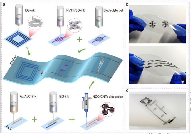 3D打印可拉伸模块化集成微系统用于无线充电钠离子微电池供电的汗液监测