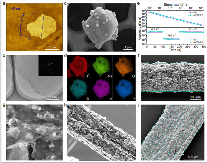 图2.电极材料表征和油墨印刷适性。(a)EG纳米片的AFM图及其相应的高度轮廓(插图)。(b)EG纳米片的TEM图和选区电子衍射图(插图)。(c)NVTP@C电极材料的SEM图和(d)相应的能量色散光谱映射。(e)EG-ink和NVTP/EG-ink的流变行为。(f)1层NVTP/EG电极的顶视图SEM图。(g)显示NVTP/EG电极表面的EG和NVTP的SEM图。(h,i)2层(h)和8层(i)NVTP/EG电极的侧视SEM图。