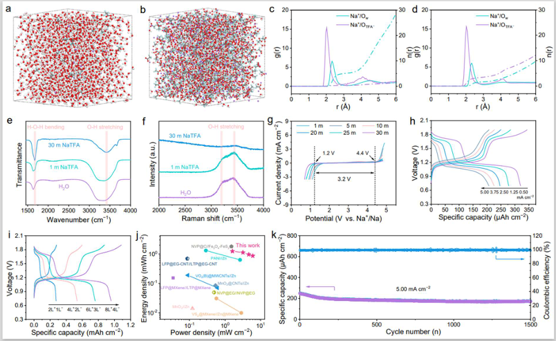 图3.NVTP/EGASMBs的电化学性能。(a,b)1m(a)和30m(b)NaTFA电解液的溶剂化结构。白色、红色、紫色、蓝色和灰色球体分别代表H、O、Na、F和C原子。(c,d)1m(c)和30m(d)NaTFA电解液的径向分布函数和配位数。(e)H2O、1m和30mNaTFA电解液的FTIR和(f)拉曼光谱。(g)不同浓度NaTFA电解液的LSV曲线。(h)ASMBs2L+1L−的倍率性能。(i)不同层数ASMBs的比容量-电压曲线。(j)ASMBs-8L+ASMBs-2L+4L−1L的稳定性的Ragone图。