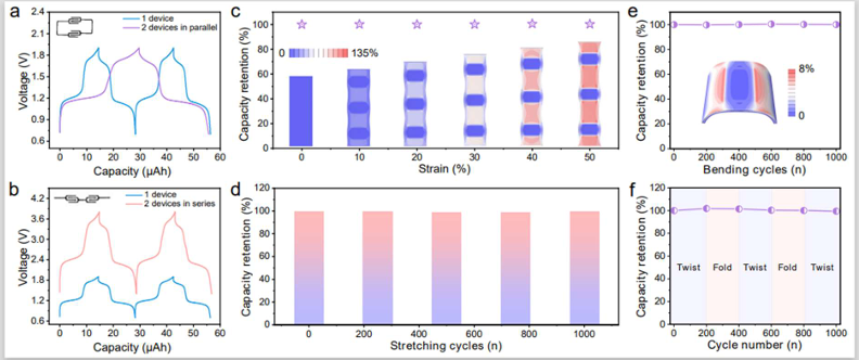 图4.NVTP/EGASMB的集成度和柔韧性。(a,b)两个并联(a)和串联(b)ASMB的恒电流充放电曲线,与单个器件的比较。插图为相应的照片。(c)并联的可拉伸ASMB阵列在不同拉伸应变下的容量保持率。插图为相应的FEA结果。(d)并联的可拉伸ASMB阵列在0-50%拉伸的不同循环后的容量保持率。(e)弹性体封装的单个ASMB在不同的弯曲循环后容量保持率。插图为相应的FEA结果。(f)在不同交替扭曲/折叠变形循环后ASMB的容量保持率。