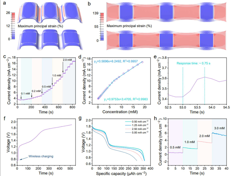 图5.模块化集成微系统的协同与传感能力。(a,b)微系统在180°弯曲状态(a)和50%拉伸状态(b)下的应变分布FEA结果。上图显示整个设备,下图去除顶部Ecoflex层。(c)NCO对不同葡萄糖浓度顺序添加的电流响应曲线(0.1mM,0.2mM,0.5mM,1.0mM和2.0mM,每种添加五次)。(d)电流密度与葡萄糖浓度之间的线性拟合关系。(e)添加0.1mM葡萄糖后NCO的响应时间。(f)ASMB的无线充电曲线。(g)无线充电后ASMB的恒流放电曲线。(h)ASMB供电下NCO对不同葡萄糖浓度的电流响应。