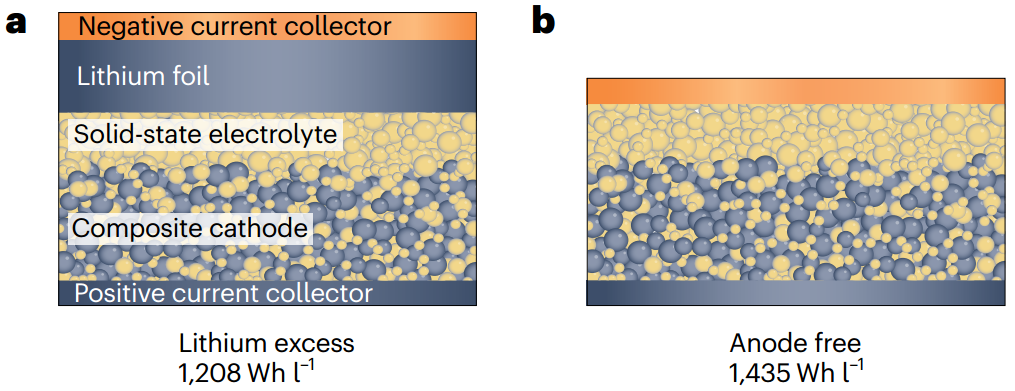 图1:SSB的结构。锂过量SSB(a)和无阳极SSB(b)的示意图。