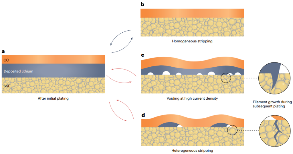 在AF-SSB中,放电阶段锂将从负极侧被剥离,回到正极。若剥离过程不均匀,会在锂层或界面区形成孔洞或空隙,使后续沉积更易集中在空洞边缘,逐步演变为不规则形貌,并导致容量持续衰减。这种“周期性不均匀剥离—孔洞积累—再沉积”的模式被视为无阳极固态电池循环失效的重要机制之一,需要在界面设计与压力控制层面加以应对。