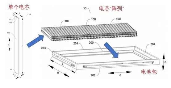 以比亚迪的刀片电池为例。比亚迪的大排片电池属于无模组方案,采用自家研发的长度大于 0.6 米的大电芯,电池单体同样向大容量进化,但电芯形状更加扁平、窄小(长边可以定制变化,单体最大稳定长度可以达到 2100mm),通过阵列的方式排布在一起,就像“刀片”一样插入到电池包里,这也是大家称之为“刀片电池”的原因。