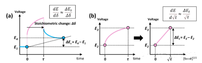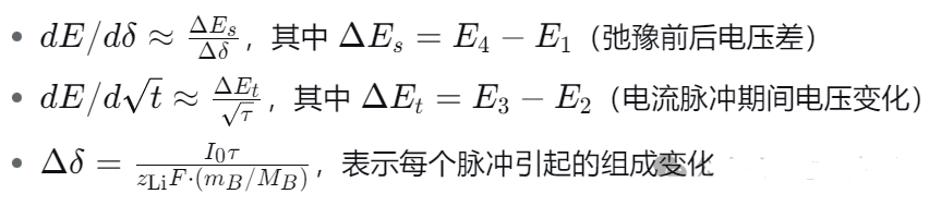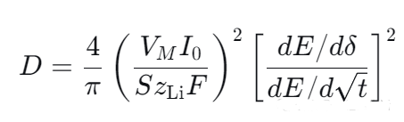 以GITT原始数据分析电极反应的极化信息,进而推测和计算反应的动力学信息。它能提供不同SOC下的扩散系数、OCV曲线和过电位信息,是研究电池材料动力学的重要手段。扩散系数D计算公式如下:
