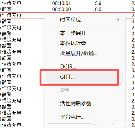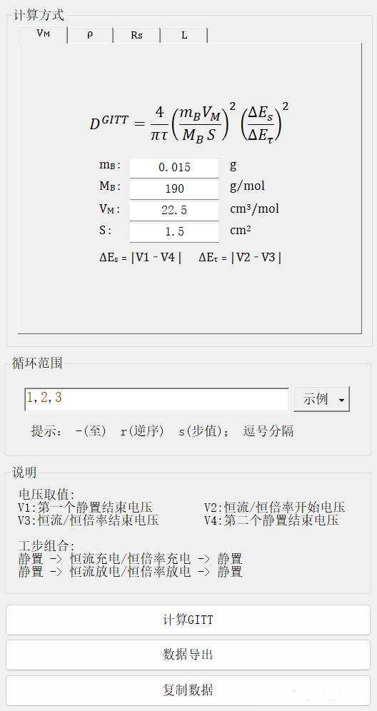 ①像蓝电最新版数据处理软件已经开发了GITT计算工具,可以自动提取出每个脉冲的E1、E2、E3、E4四个电压,填写化学条件参数mB、MB、S、VM等参数自动计算每个SOC下的扩散系数。