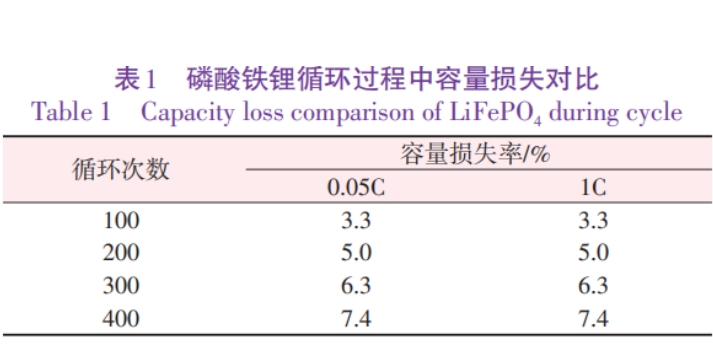 根据文献研究,磷酸铁锂循环衰减的主要原因一方面是活性锂的损失,另一方面是阻抗增加导致极化变大,容量下降较快。当测试电流足够小时,电池极化很小,可以排除由于极化引起的容量损失。表1对比了循环过程中1C和0.05C测试的磷酸铁锂容量损失情况。从表1看出,容量损失与测试电流无关,因而排除了极化带来的容量损失,也就是说在前期循环过程中容量损失来自于成膜的消耗。