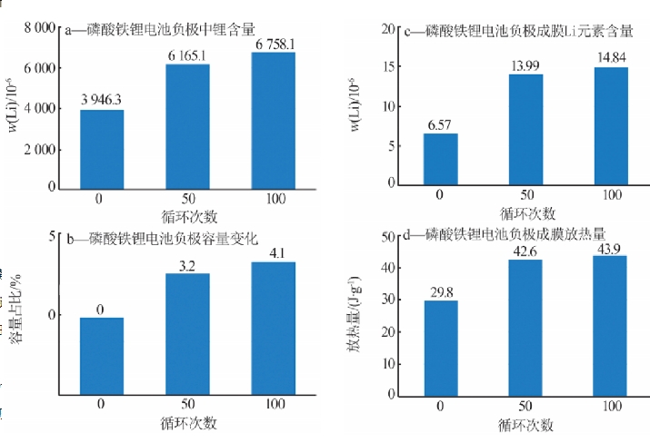 通过实验手段对上述理论进行验证。图2a为通过ICP测试的新鲜电池、循环50次、循环100次两种电芯负极片中的锂含量。从图2a看出,在各个阶段负极片中的锂含量均是三元电池高于磷酸铁锂电池。