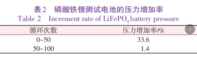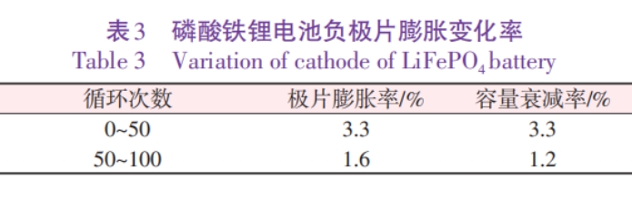 表3为负极片膨胀变化率。通过表3中拆解电池的极片膨胀率可知,前50次极片膨胀率为3.3%,相应的容量衰减率为3.3%,50~100次的极片膨胀率为1.6%,相应的容量衰减率为1.2%,极片膨胀与容量衰减是相对应的。因而磷酸铁锂前期衰减快的原因主要是负极体系膨胀导致SEI膜破坏,而破坏的SEI 膜重新修复会消耗活性锂,因而导致容量衰减快。