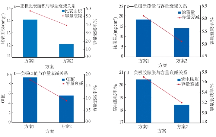 图 4 磷酸铁锂前期循环改善方法与容量衰减率的关系从负极方面考虑,膨胀大的负极会加速SEI膜的破坏与修复,增加活性锂的消耗。文献报道,在充满电过程中晶格逐渐膨胀,与此同时颗粒会伴随着发生结构调整来使得自身应力得到释放。负极材料OI值代表石墨材料的取向系数,是表征石墨负极在嵌锂过程中膨胀率的一项重要指标。石墨材料OI值大,说明在充满电过程中晶格膨胀大,导致负极体系膨胀大,加速SEI膜消耗。图4b为负极OI值与容量衰减率的关系。其中:方案1为负极OI值较大的方案;方案2为负极OI值较小的方案。从图4b看出,当OI值范围为5~10时,OI值增加65%,极片反弹率增加4.1%,容量衰减率增加0.9%。图4c为负极涂覆量与容量衰减率的关系。其中:方案1为负极涂覆量较高的方案;方案2为负极涂覆量较低的方案。从图4c看出,涂覆量增加30%,极片反弹率增加9%,容量衰减率增加1.0%。图4d为负极胶膨胀率与容量衰减率的关系。其中:方案1为负极胶膨胀较高的方案;方案2为负极胶膨胀较低的方案。从图4d看出,胶膜反弹率增加20%,极片反弹率增加2%,容量衰减率增加0.5%。OI值、涂覆量、胶膜膨胀增大,导致极片的反弹增加,而负极膨胀对SEI膜的破坏性增加,导致活性锂消耗增加,容量衰减加速。