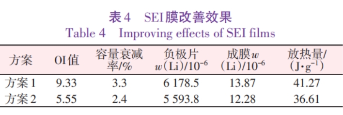 针对上述提到的改善因素,从分析SEI膜稳定性方面进行验证。表4为SEI膜改善效果。从表4看出,以负极OI值为例,当负极材料OI值从9.33降低至5.55时,循环100次后容量衰减从3.3%降低至2.4%,ICP测试负极片中锂质量分数由6.1785×10–3降低至5.593 8×10–5,EDS测试负极片表面SEI膜Li元素质量分数由1.387×10–5降低至1.228×10–5,DSC测试负极片放热量由41.27J/g降低至 36.61J/g,证实了改善循环的可行性。