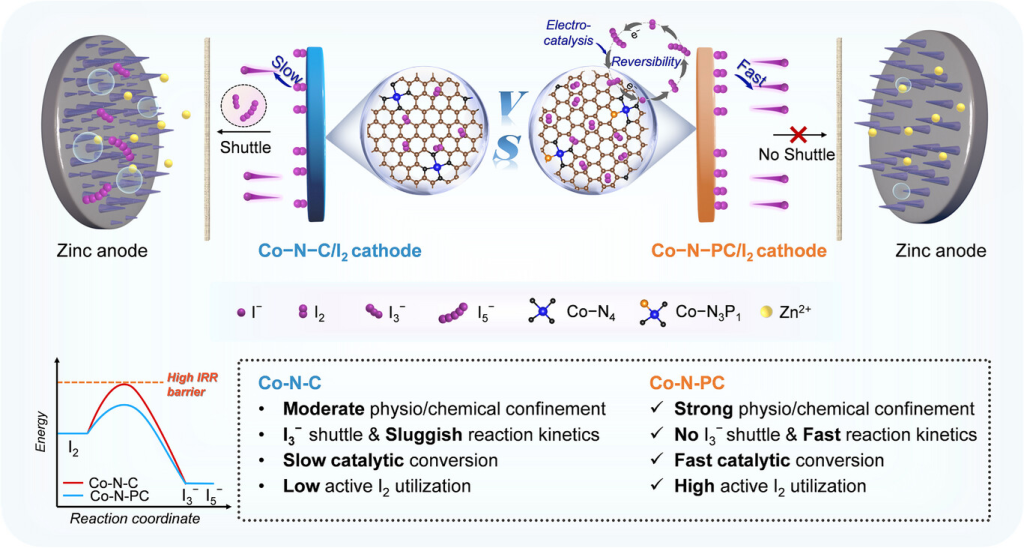 图示1. AZIB中Co−N−PC/I2正极的设计原理以及与Co−N−C/I2和Co−N−PC/I2正极的比较,重点关注碘的转化过程和能垒。