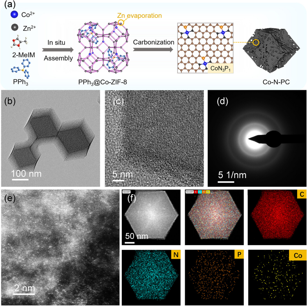 图1. a) Co–N–PC催化剂的合成示意图;b-d) C3的TEM、HRTEM和SAED图;e) C3的HAADF-STEM图;f) C3的EDX映射图。