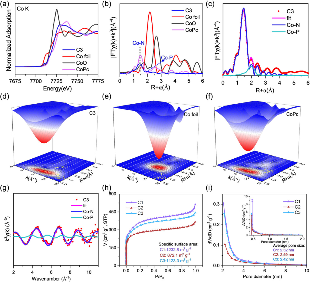 图2.a、b)以Co箔、CoO和CoPc为参考物的C3的XANES和FT-EXAFS光谱;c)C3的R空间拟合曲线;d-f)以Co箔和CoPc为参考物的C3的小波变换结果;g)C3的k空间拟合曲线;h、i)C1-C3的氮吸附-解吸等温线和孔径分布