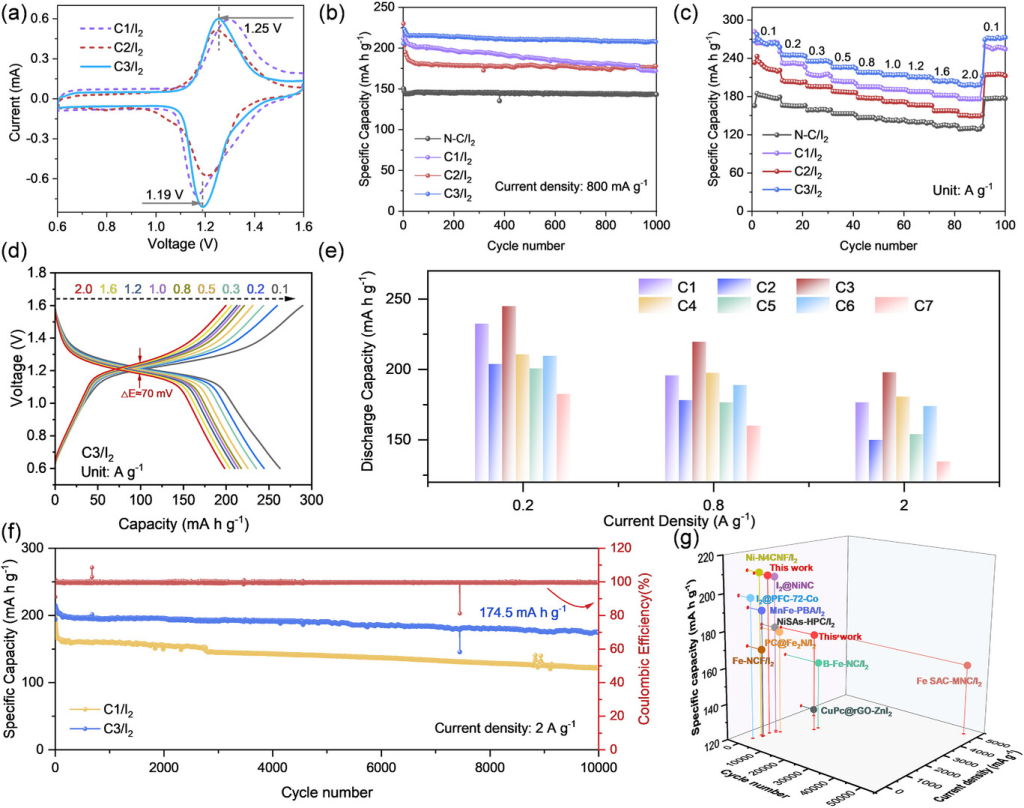图3.a)C1/I2–C3/I2正极的CV曲线;b)N−C/I2和C1/I2–C3/I2正极的循环性能;c)N−C/I2和C1/I2–C3/I2正极的倍率性能;d)不同电流密度下C3/I2正极的GCD曲线;e)显示C1/I2–C7/I2正极倍率能力的条形图;f)C1/I2和C3/I2正极的长期循环性能以及C3/I2正极在2Ag−1下的相应库仑效率;g)与报道的碘正极的循环性能比较。