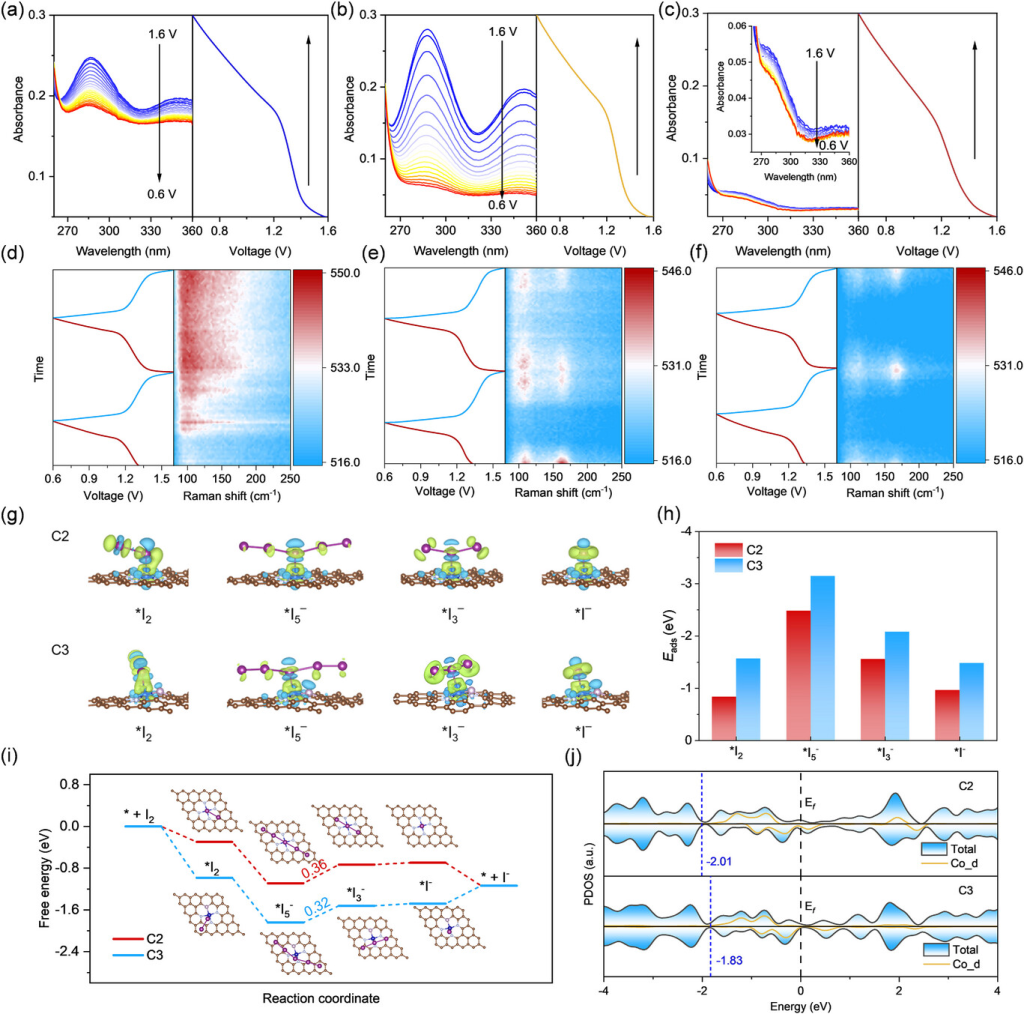 图4. a–c)C1/I2−C3/I2正极的原位紫外可见光谱和放电曲线;d–f)分别为C1/I2−C3/I2的GCD曲线和原位拉曼光谱;g)吸附在C2和C3上的I−、I2、I3−和I5−的电荷差图。绿色部分表示电荷积累,蓝色部分表示电荷耗尽。绘图使用的等值面值为0.002eÅ−3;h)吸附在C2和C3上的I−、I2、I3−和I5−的吸附能;i)I2在C2和C3上还原反应的吉布斯自由能分布;j)C2和C3在费米能区附近的投影态密度(PDOS)。