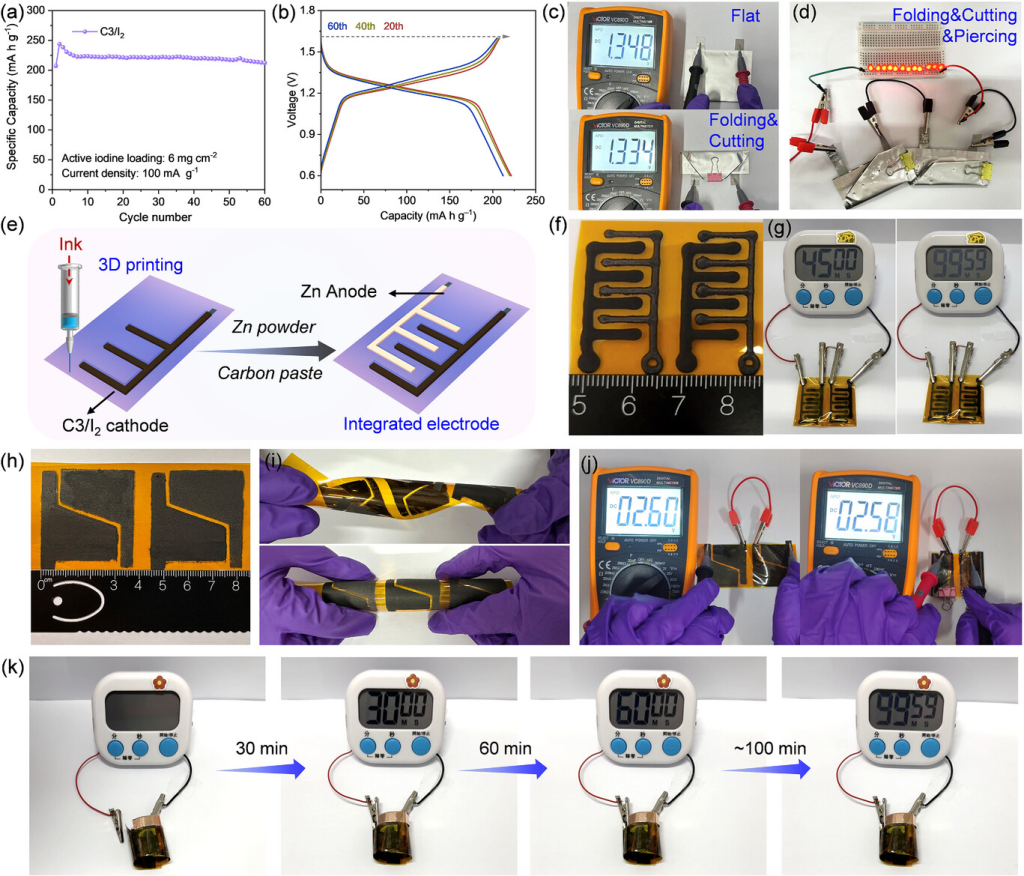 图5. C3/I2正极的电化学性能和实际应用。a)循环稳定性和b)0.1Ag−1下软包装电池的GCD曲线;c)平坦、折叠和切割条件下的电压稳定性;d)两个串联的软包装电池为红色LED供电。3D打印集成微电池:e、f)制造过程示意图和数字图像;g)由两个串联微电池供电的定时器操作。基于丝网印刷技术的FZMB:h、i)平坦和扭曲条件下FZMB的数码照片;j)平坦和弯曲变形下的电压稳定性;k)弯曲条件下保持定时器功能。