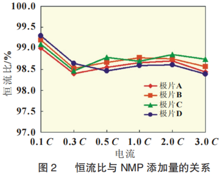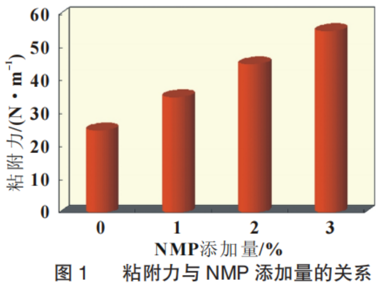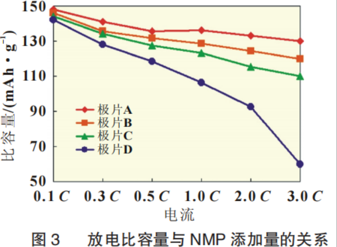 通过添加NMP可以提高正极片的粘附力,且粘附力随NMP的添加量增大逐渐增强。加入NMP后,会将极片上的酸性基团中和,可以降低极片表面电子的损失,阻止浆料发生触变,增加粘结剂与集流体的附着力,使正极浆料分散均匀、流动性提高,从而提高浆料和极片的利用率。NMP添加量小于1%时,不会影响电池的倍率放电性能,并能提高电池的循环特性,但当NMP添加量大于1%时,NMP会影响正极片的放电比容量和中值电压,并降低电池的循环特性。