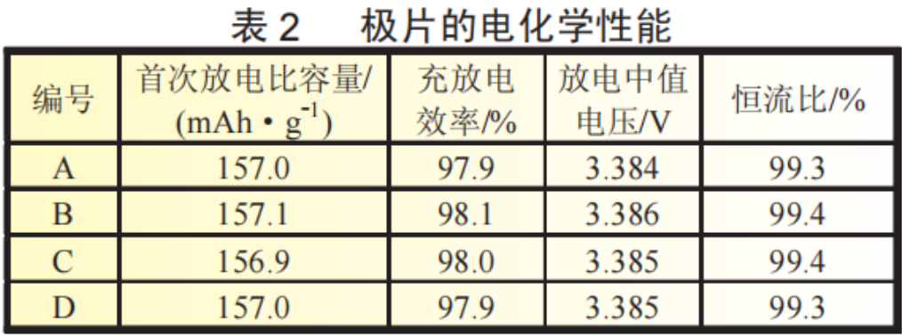 表2所示为极片的电化学性能测试结果。首次放电比容量、充放电效率、放电中值电压和恒流比的数值也基本相同。这说明添加NMP对正极片的正极活性物质的放电容量和充放电特性没有影响。