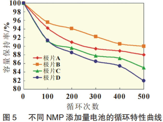 图5所示为4种电池的循环性能曲线,观察图5可发现,刚开始进行充放电循环时,极片A和极片B的容量衰减趋势相近,极片C与极片D的容量衰减趋势相近,而极片C和极片D的衰减速度较大。随着循环的继续进行,极片A、C和D的衰减加速,极片B衰减速度基本不变,最终电池容量保持率为极片D<C<A<B。这说明当NMP添加量小于1%时有利于提高电池的循环特性,当NMP添加量大于1%后电池的循环特性会受到影响。