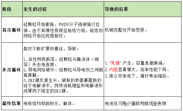 将脆弱的PVDF与体积剧烈变化的硅结合在一起,会引发一系列连锁反应,最终导致电池快速失效:
