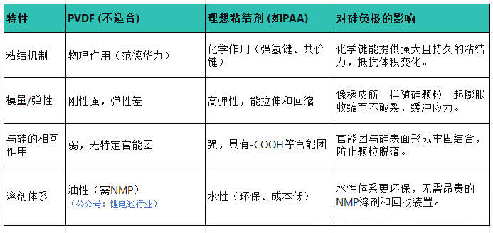 为了让您更直观地理解,下表对比了PVDF和理想硅负极粘结剂(以PAA为例)的关键特性: