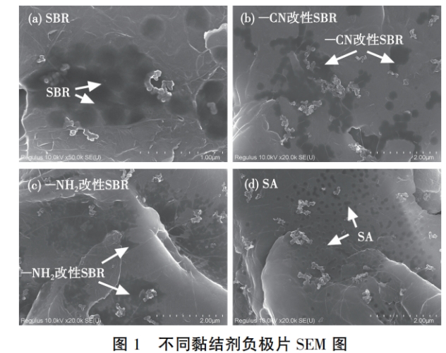 不同负极黏结剂极片的SEM图见图1。从图1可知,SBR类黏结剂在极片内的分布较集中,呈现出多颗粒团聚的状态,颗粒互相粘连并呈片状分布,如图1(a)、图1(b)和图1(c)中箭头标识所示。SA 类黏结剂在极片内的分布较为分散,颗粒之间没有粘连,并以单颗粒形式分布在表面,如图1(d)深色区域所示。