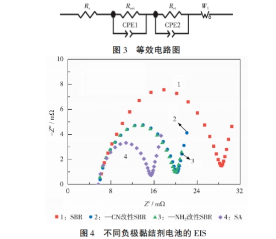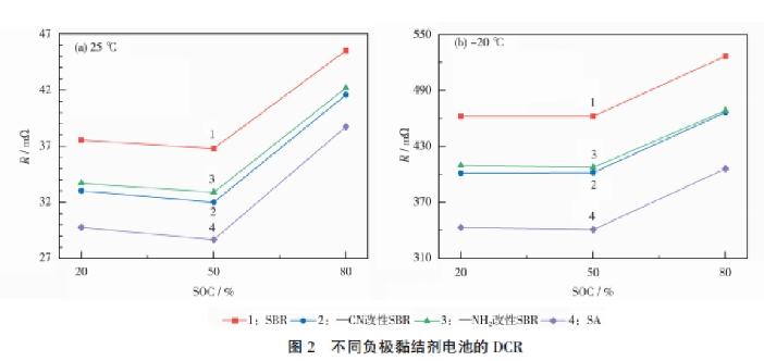 用扫描电子显微镜观察黏结剂在极片中的形貌。用 多通道电化学工作站进行电化学阻抗谱(EIS)测试,测试电芯的开路电压为3.8V。用高精度充放电设备进行直流内阻(DCR)测试,流程为:在25℃下,在20%、50%、80%的SOC下以3.00C放电30s;在-20℃下,在20%、50%、80%的SOC下以0.36C放电30s,电压为2.8~4.2V。放电初始电压与结束电压之差,与放电电流的比值,即为DCR。