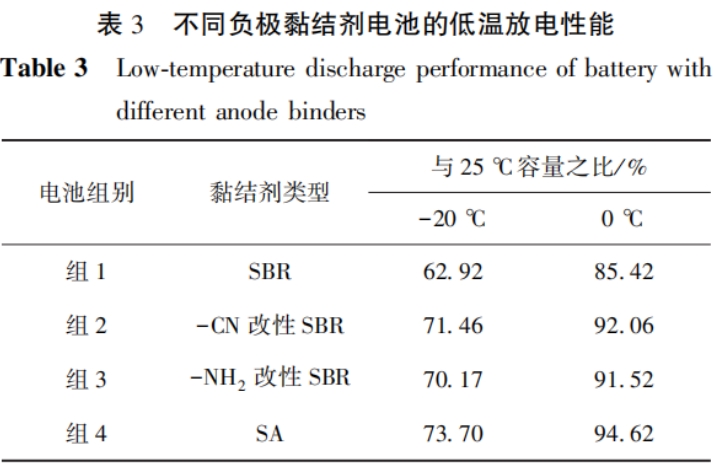 在-20℃和0℃下,不同黏结剂电池以1.0C放电的性能见表3。从表3可知:在-20℃下,组4电池与组1电池与25℃容量之比分别为73.70%与62.92%,差值为10.78个百分点;在0℃下,组4电池与组1电池与25℃容量之比分别为94.62%与85.42%,差值为9.20个百分点。分析可知,SA黏结剂中存在的酯类官能团可以改善黏结剂与电解液的亲和性,在低温条件下有利于放电过程中 Li+的迁移。