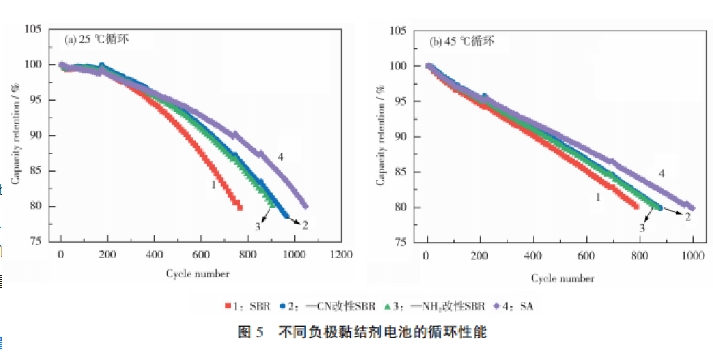 这是因为SBR类黏结剂团聚后形成颗粒堆积,相比于分散分布的SA类黏结剂,SBR类黏结剂在负极表面的有效包覆面积更小,意味着负极材料更容易暴露在电解液中,在高温下,使用SBR类黏结剂的负极会更频繁地与电解液发生副反应,造成活性锂损失与容量衰减。