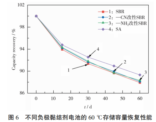 电池充满电后在温度为60℃的环境下搁置60d,容量恢复率的对比见图6。从图6可知,在第60d时,组1~组4电池的容量恢复率分别为87.93%、88.12%、88.33%和89.32%,其中组4电池在高温存储后容量稳定性最佳,表明在高温下,SA类黏结剂的稳定性优于SBR类黏结剂。