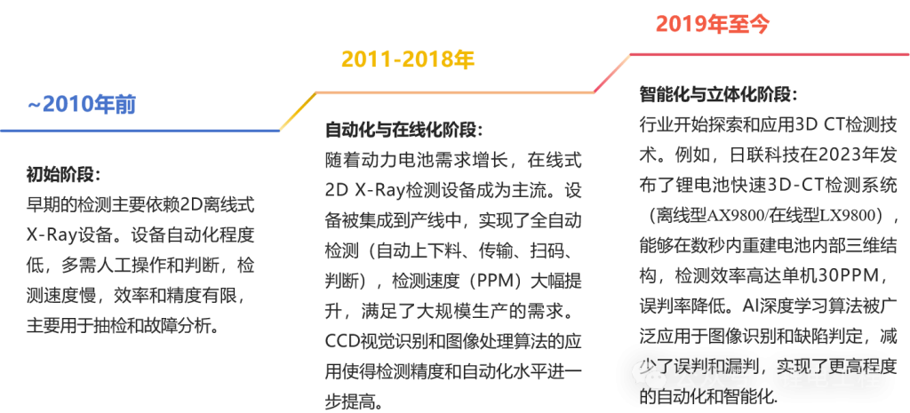 锂电X-Ray检测设备的发展与锂电产业自身的发展紧密相连,主要经历了以下几个阶段